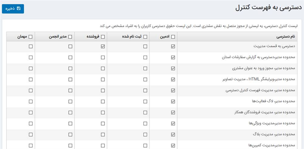 در این صفحه نقش های متعدد تعریف شده مانند مهمان، ثبت نام شده و… را مشاهده می کنید (این نقش ها در بخش نقش های مشتری تعریف شده اند) برای دسترسی دادن کاربران به بخش های مختلف وبسایت فقط کافی است که تیک مواردی را که می خواهید کاربر دسترسی داشته باشد را فعال کنید و سپس بر روی دکمه ذخیره کلیک کنید.