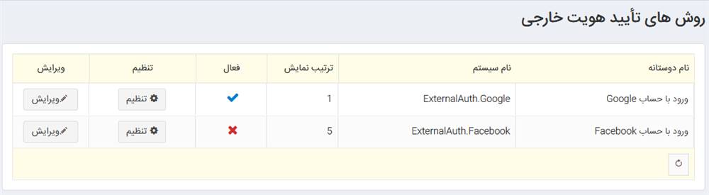 در این صفحه نمایی از کلیه روش های تأیید هویت خارجی که ماژول آن را خریداری کرده اید را مشاهده میکنید.
